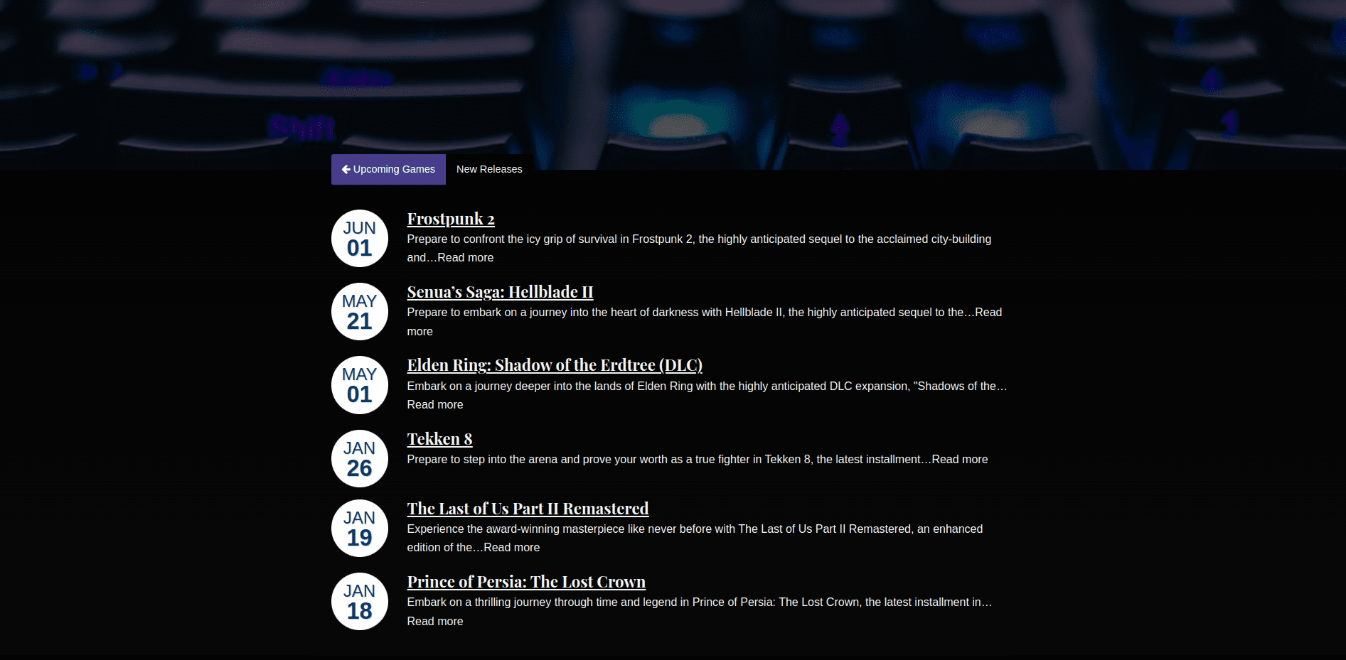 • Upcoming Games: Posts are ordered by release date, displaying the release date prominently. Once games are released, they are archived and moved to a separate page.