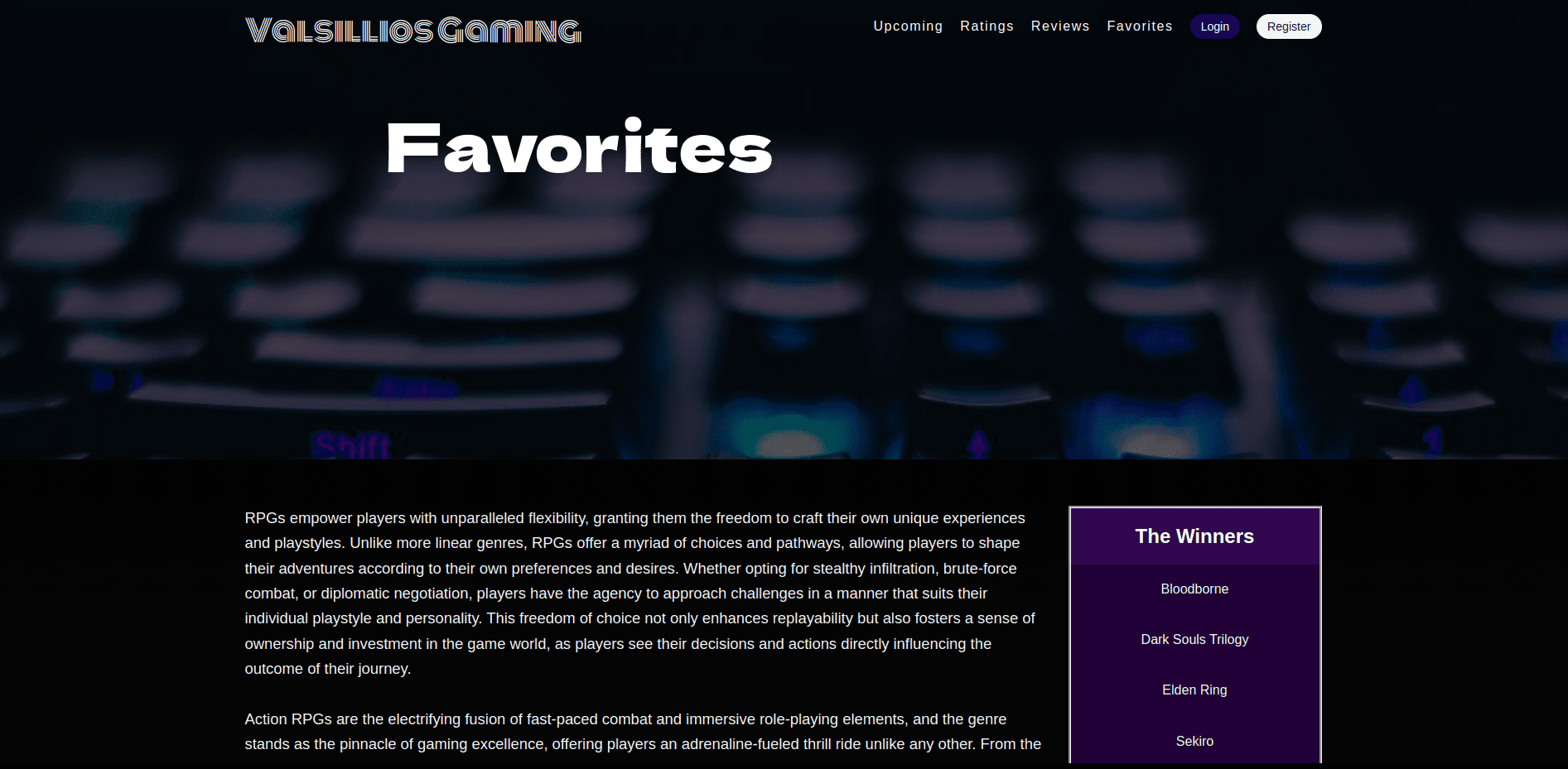 Every line of code on ValsilliosGaming.net was written from scratch. Utilizing HTML for structure, CSS for styling, JavaScript for interactive elements, and PHP for dynamic content management, I ensured that the site is both functional and visually engaging.